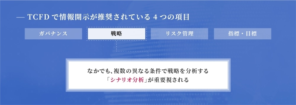 「TCFD」では「ガバナンス」「戦略」「リスク管理」「指標・目標」の4項目について、自社への財務的影響のある気候関連情報を開示することを推奨している。さらに、気候変動関連のリスクや機会は中長期的に現れる場合が多いことから、特に「戦略」分野においては、複数の異なる条件で戦略を分析する「シナリオ分析」を取り入れた情報開示が求められている。戦略立案時に「シナリオ分析」をしておくことにより、様々な対応策を事前に検討し、適切な準備をしておくことが可能となる。